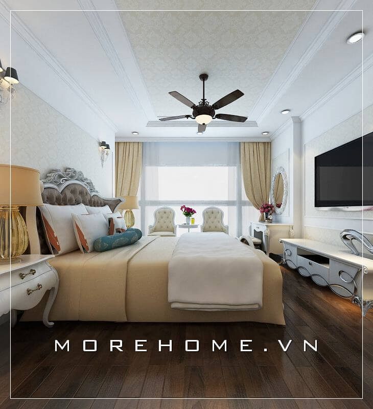 Lựa chọn nội thất gam màu trắng chủ đạo kết hợp với sàn gỗ ấm áp tạo hiệu ứng rộng và thoáng hơn cho không gian phòng ngủ chung cư phong cách tân cổ điển