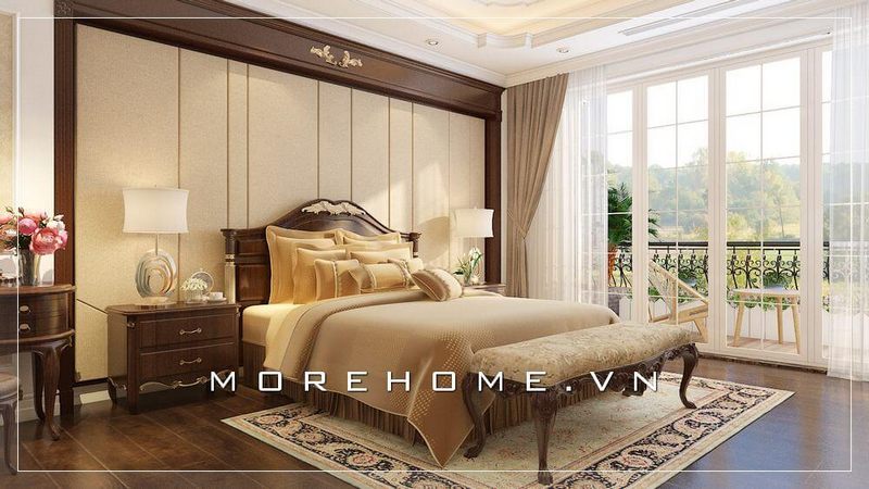 Đặc trưng của thiết kế nội thất phòng ngủ tân cổ điển là sự cầu kỳ tập trung ở đường nét đầu giường bởi lối trang trí hoàng gia
