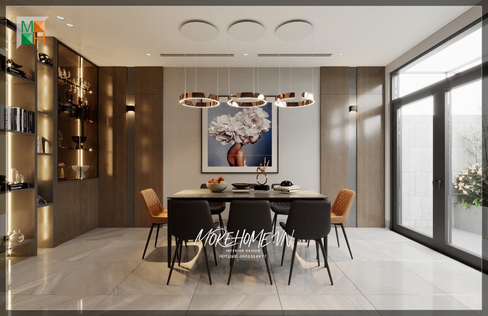 Trang trí phòng ăn với hệ thống treo dán tường và đèn cho không gian thêm sinh động
