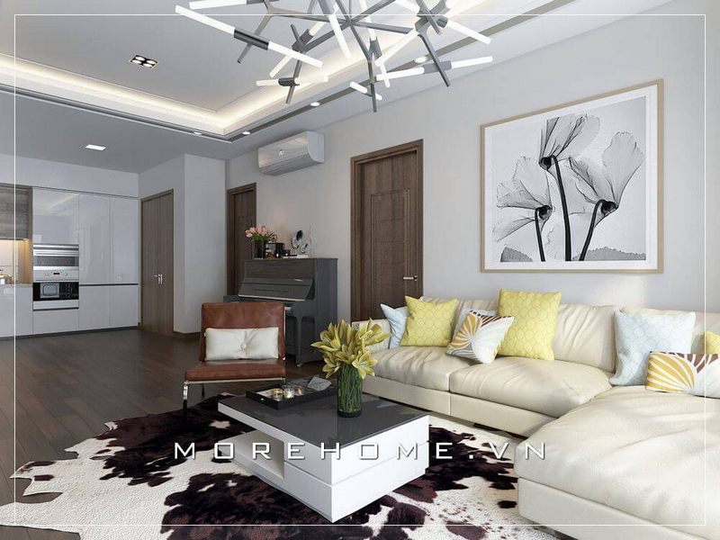 Vẻ đẹp sang trọng, thanh thoát tiện nghi của bộ sofa góc bọc da cao cấp nổi bật trong không gian phòng khách căn hộ chung cư hiện đại.
