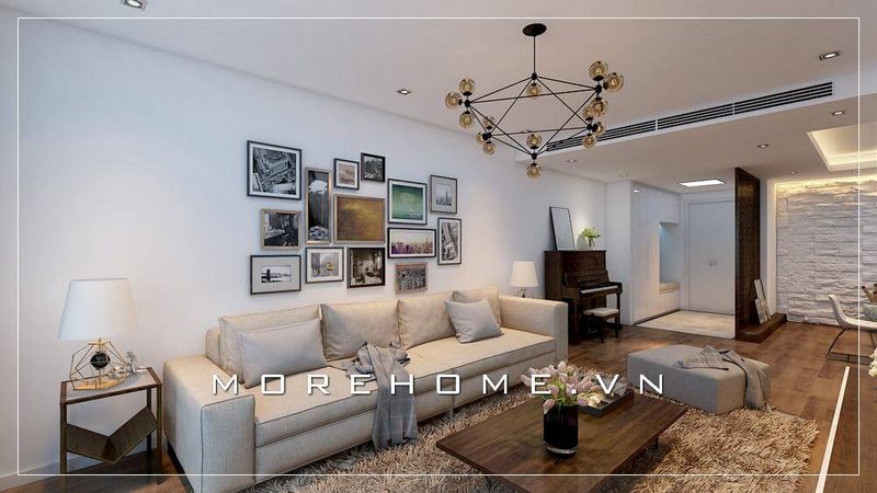 Không gian phòng khách căn hộ chung cư đầy thu hút với tâm điểm là bộ sofa gỗ óc chó cao cấp được thiết kế theo phong cách hiện đại trẻ trung kết hợp hài hòa cùng vỏ bọc da nâu tiện lợi, tinh tế.