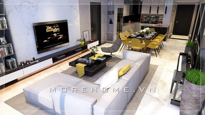 Thiết kế bàn ăn hiện đại liền kề với phòng khách, không hề có vách ngăn tạo độ mở và liền mạch cho không gian.