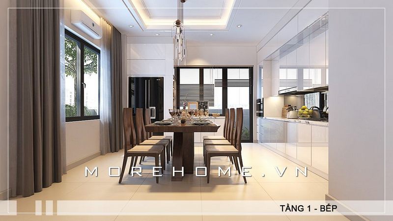 Không gian phòng ăn sang trọng vớ bộ bàn ăn gỗ tự nhiên theo phong cách Châu Âu độc đáo