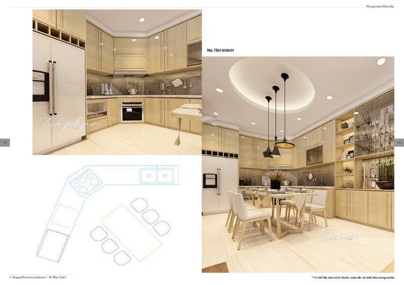 Tủ bếp hiện đại với thiết kế nhiều ngăn tiện lợi để cất trữ đồ đạc đồng màu, chất liệu với bộ bàn ăn tạo nên sự gắn kết thống nhất cho cả không gian