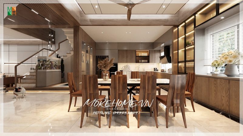 . Không gian bếp - ăn của biệt thự được mở rộng hơn bằng cách sử dụng đá trắng lát nền và ốp tường kết hợp với tủ bế, bàn ghế gỗ óc chó nâu mang lại sự sang trọng.