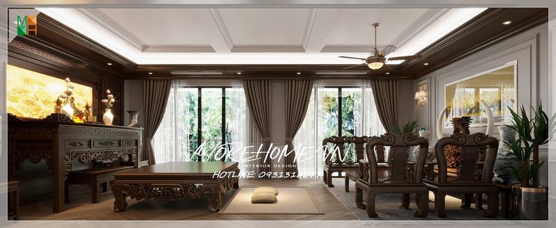 Đường vân uốn lượn từ đá ốp tường cao cấp kết hợp với bức vách ốp tường hoa văn trang nhã đã tạo nên một bức tranh tuyệt đẹp cho phòng khách của biệt thự Riverside Nguyễn Duy Trinh, Quận 2, Tp. Hồ Chí Minh.