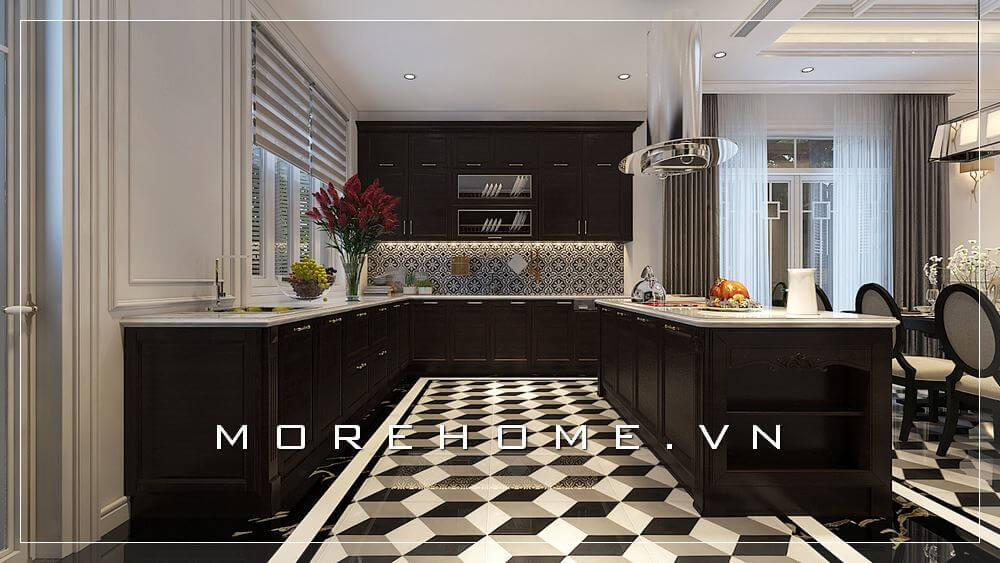 Thiết kế nội thất phòng bếp biệt thự hiện đại sử dụng tone màu trắng - đen tạo không gian hài hòa và ấn tượng
