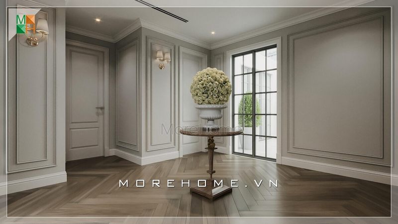 Biệt thự, nhà phố được thiết kế với màu trắng tinh tế cao cấp và hành lang rộng, trung tâm chú ý là bàn gỗ óc chó độc đáo cuốn hút.