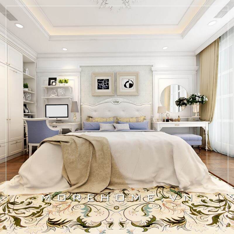 Gia chủ sẽ được cảm nhận sự thanh lịch, thoải mái khi phòng ngủ được trang trí nội thất với gam màu trắng chủ đạo.