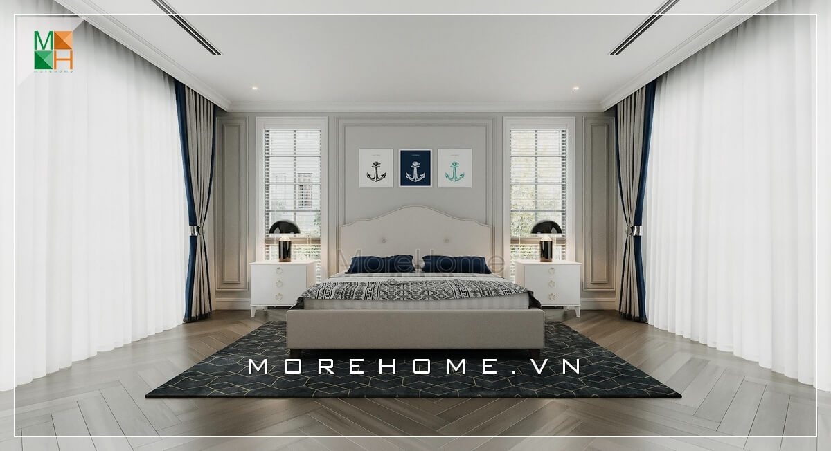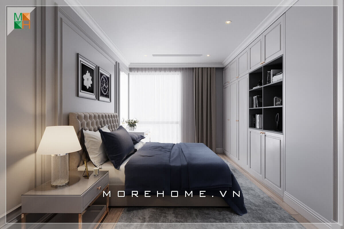 Tone màu chủ đạo của căn phòng ngủ là trắng và xám thích hợp cho phòng ngủ mang phong cách tân cổ điển sang trọng.