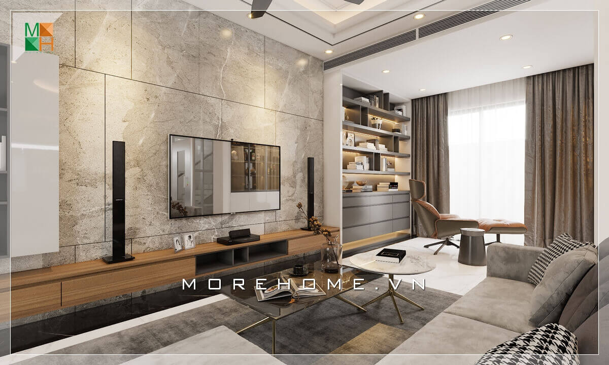 Bố trí phòng khách kết hợp giữa tone đối sánh giữa trắng và nâu trầm của gỗ óc chó tạo vẻ đẹp độc đáo cho phòng khách căn hộ chung cư.